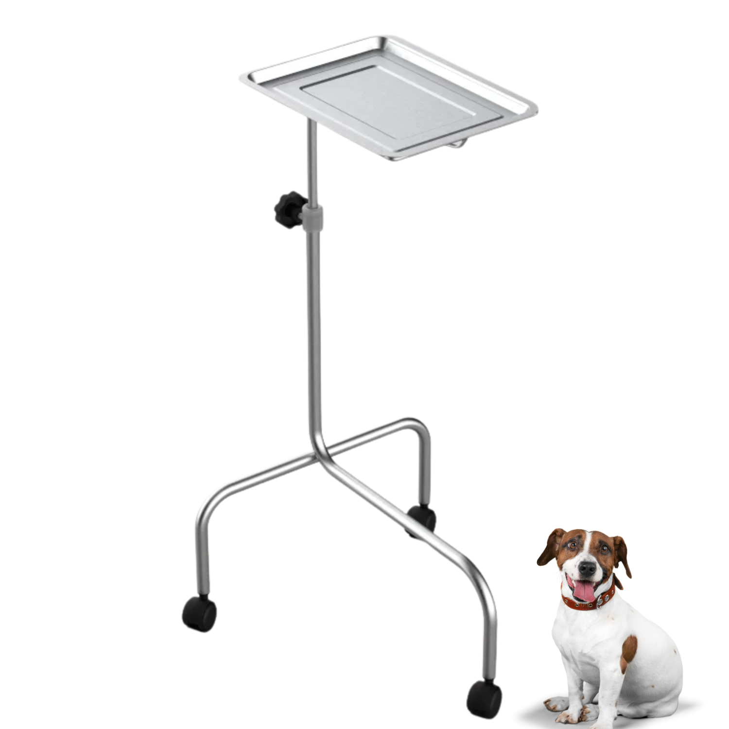 Características: Base fabricada em Aço SAE 1020, tubo redondo Ø 3/4" x 0,90 mm de espessura, sistema telescópico de elevação, fabricado em Aço SAE 1020, tubo redondo Ø 5/8" x 0,90mm de espessura, com reforços em Aço SAE 1020 tubo redondo Ø 3/8" x 0,90mm de espessura. Apio da bandeja fabricado em SAE 1020 tubo redondo Ø 3/8" x 0,90mm de espessura. Apoios 03 Rodízios giratórios de Ø 3". Bandeja fabricada em aço inoxidável e medindo C43xL30,5. Acabamento com pintura eletrostática (pó) secagem em estufa e/ou tratamento antiferruginoso. Haste de regulagem de altura e apoio da bandeja zinco. Elevação com regulagem de altura através de manípulo lateral. Dimensões comprimento da base 505mm, largura da base 500mm, altura mínima 796mm, altura máxima 1136mm. Carga estática de 15kg. Peso 2,7kg.